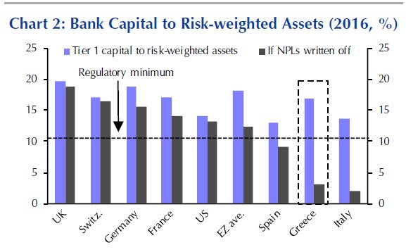 Εάν τα NPLs αυτά διαγραφούν πλήρως, ο δείκτης κεφαλαίου των ελληνικών τραπεζών προς το σταθμισμένο σε κίνδυνο ενεργητικό (RWA) θα μειωνόταν στο 3%