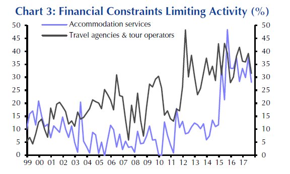 Για παράδειγμα, παρά τη μεγάλη ζήτηση, περίπου το ένα τρίτο των εταιρειών του τουριστικού τομέα αναφέρουν ότι οι οικονομικοί περιορισμοί εμποδίζουν τη δραστηριότητα.