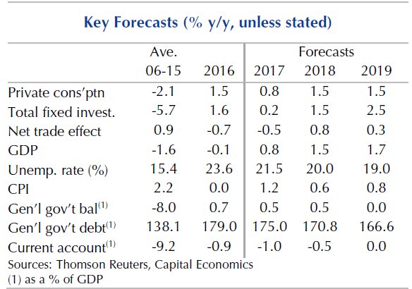 Λαμβάνοντας υπόψη αυτά τα θέματα, η Capital Economics επαναλαμβάνει την εκτίμηση ότι η Ελλάδα ενδέχεται να χρειαστεί ακόμα ένα τέταρτο σχέδιο διάσωσης μετά τη λήξη του τρέχοντος τον Αύγουστο του 2018.