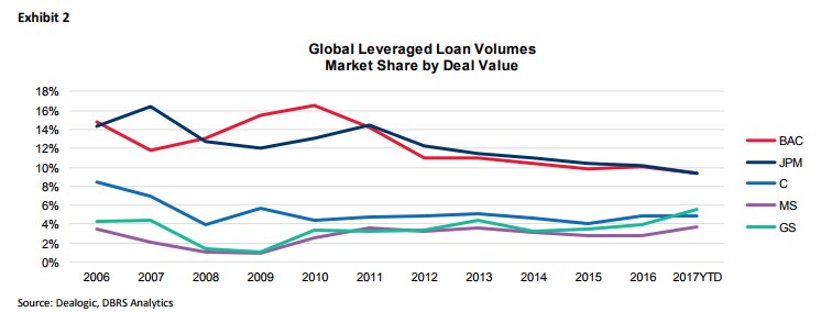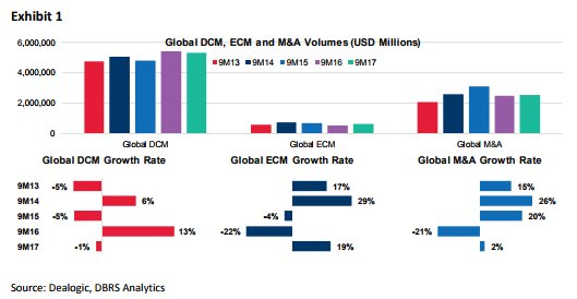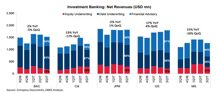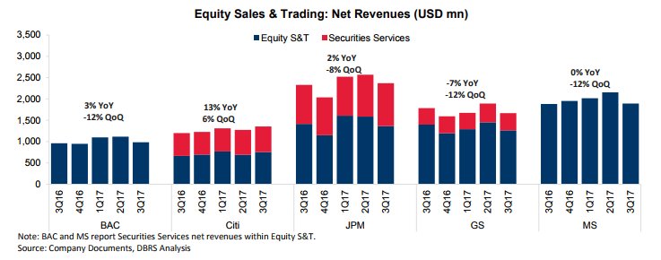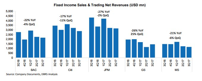 Ο οίκος σχολιάζει ότι τα εταιρικά αποτελέσματα του τρίτου τριμήνου 2017 ήταν μικτά, με τις ισχυρές επιδόσεις στην επενδυτική τραπεζική να αντισταθμίζουν τα χαμηλότερα αποτελέσματα στις συναλλαγές σταθερού εισοδήματος.
