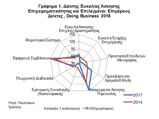 Συγκεκριμένα, με βάση τον γενικό δείκτη «ευκολία ασκήσεως επιχειρηματικής δραστηριότητας», η Ελλάδα κατετάγη στην 67η θέση το 2017, από την 61η θέση το 2016.