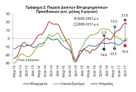 Τέλος, ο γενικός δείκτης Οικονομικού Κλίματος στην Ελλάδα, με βάση τα τελευταία στοιχεία της Ευρωπαϊκής Επιτροπής, υπεχώρησε ελαφρά τον Οκτώβριο του 2017, στο 98,3, έναντι 100,6 τον Σεπτέμβριο του 2017.