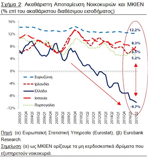 Για παράδειγμα, το 2ο τρίμηνο 2017 ο ρυθμός αποταμίευσης των νοικοκυριών στην Ελλάδα, στην Ιρλανδία, στην Ισπανία και στην Πορτογαλία διαμορφώθηκε στο -9,7%, 8,3%, 6,5% και 5,2% αντίστοιχα.