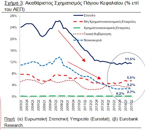 Εν παραδείγματι, ο ακαθάριστος σχηματισμός πάγιου κεφαλαίου στην Ελλάδα ήταν στο 11,5% του ΑΕΠ το 2ο τρίμηνο 2017 (βλέπε Σχήμα 3).