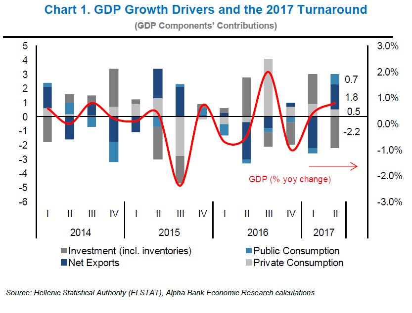 Η οικονομία επέστρεψε στην ανάπτυξη, καθώς το πραγματικό ΑΕΠ επεκτάθηκε τόσο το 1ο όσο και το 2ο τρίμηνο του 2017, έναντι πτώσης στο 4ο τρίμηνο του 2016 (Q4 2016: -1,1%, Q1 2017: + 0,4%, Q2 2017: + 0,8%, μεταβολές σε ετήσια βάση).