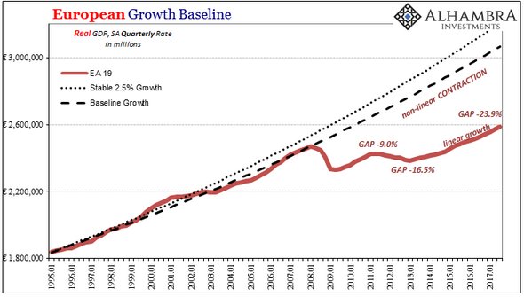 Το χάσμα πριν από την κρίση στην Ευρώπη είναι ουσιαστικά σημαντικά μεγαλύτερο μετά από τέσσερα και μισό χρόνια σταθερής "ανάπτυξης" από ό, τι στο κατώτατο σημείο της καμπύλης ύφεσης που έφτασε το πρώτο τρίμηνο του 2013.