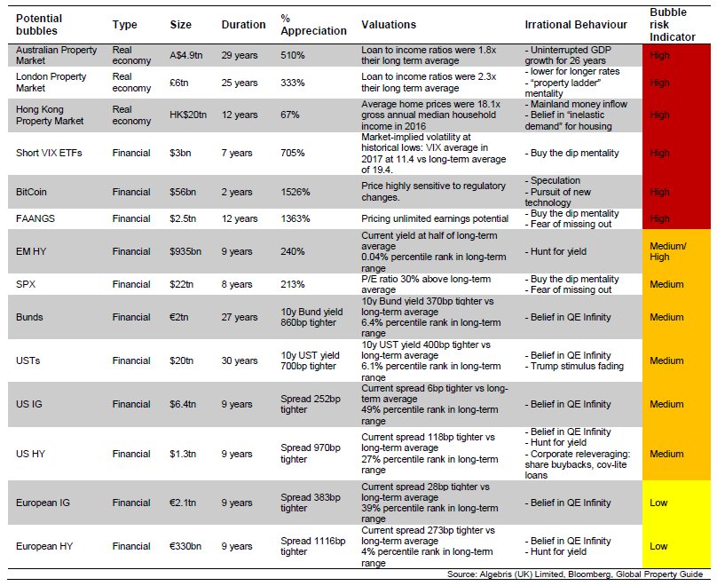 Μεταξύ των αγορών που μπορούν να αποδειχθούν φούσκες τα πιο ανησυχητικά σημάδια είναι στις αγορές ακινήτων σε Αυστραλία, Λονδίνο και Χονγκ Κονγκ.