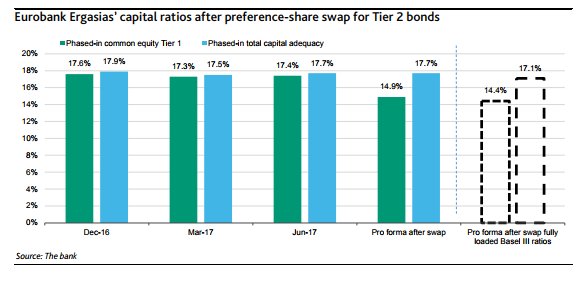 Συνεπώς, ανεξάρτητα από την εξαγορά αυτών των προνομιούχων μετοχών με ομόλογα Tier 2, ο οίκος αναμένει ο δείκτης κεφαλαιακής επάρκειας CET1 να μειωθεί σημαντικά από περίπου 17,4% τον Ιούνιο του 2017, σε περίπου 14,9%.