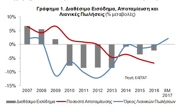 Παρά τη στασιμότητα της οικονομικής δραστηριότητας το 2016 και την ελαφρά άνοδο στο πρώτο εξάμηνο του 2017, το διαθέσιμο εισόδημα των νοικοκυριών μετά την πληρωμή των φορολογικών υποχρεώσεων συνέχισε την πτωτική πορεία, όπως φαίνεται στο Γράφημα 1.