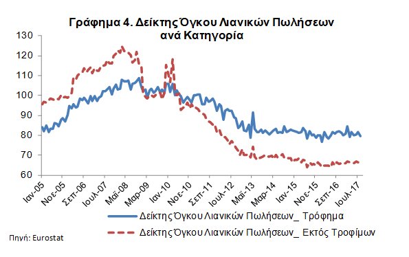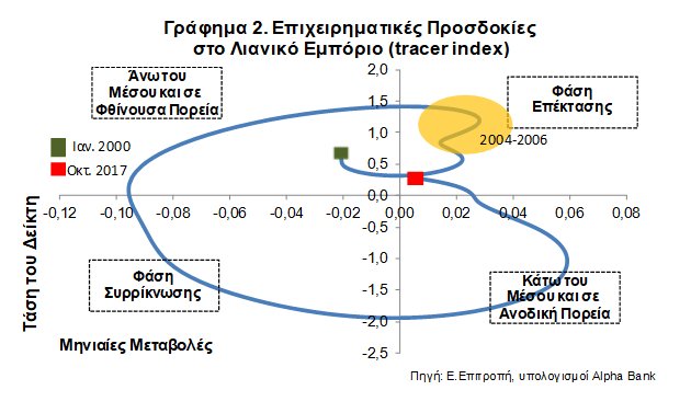 Παρατηρούμε ότι, ο δείκτης επιχειρηματικών προσδοκιών στο λιανικό εμπόριο όχι μόνο κινείται σε επίπεδα άνω του μακροχρόνιου μέσου επιπέδου της HPf τάσεως, αλλά ο δείκτης βρισκόταν στο δεκάμηνο του 2017 εκ νέου στην περιοχή της επεκτάσεως (υποδεικνύεται με την κόκκινη κουκίδα), μετά την παλινδρομική κίνηση κατά το έτος εισαγωγής των κεφαλαιακών ελέγχων.