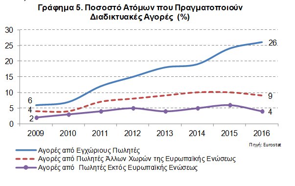 Τη μεγαλύτερη, ωστόσο, αύξηση παρουσιάζει το ποσοστό των ατόμων που πραγματοποίησαν διαδικτυακές αγορές από εγχώριες επιχειρήσεις ήτοι από 6% το 2009 σε 26% το 2016.