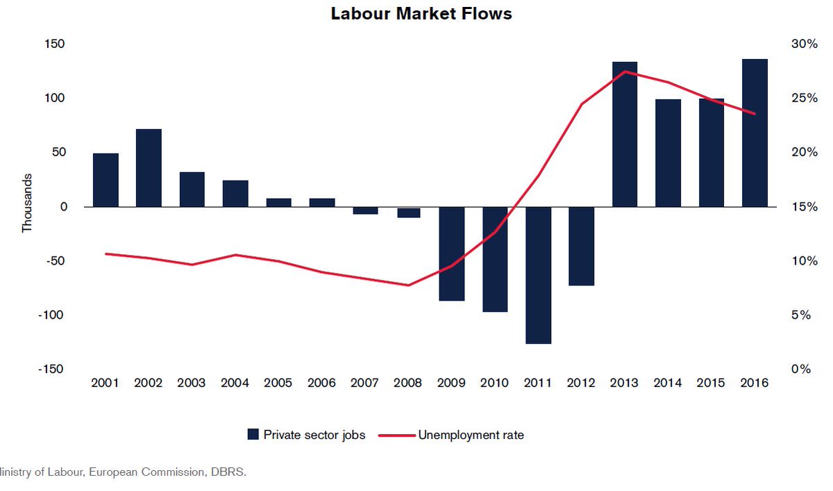 «Η δημιουργία θέσεων εργασίας στον ιδιωτικό τομέα ήταν ισχυρή τα τελευταία τέσσερα χρόνια, με περισσότερες από 100.000 νέες θέσεις εργασίας τον χρόνο κατά μέσο όρο», σημειώνεται.