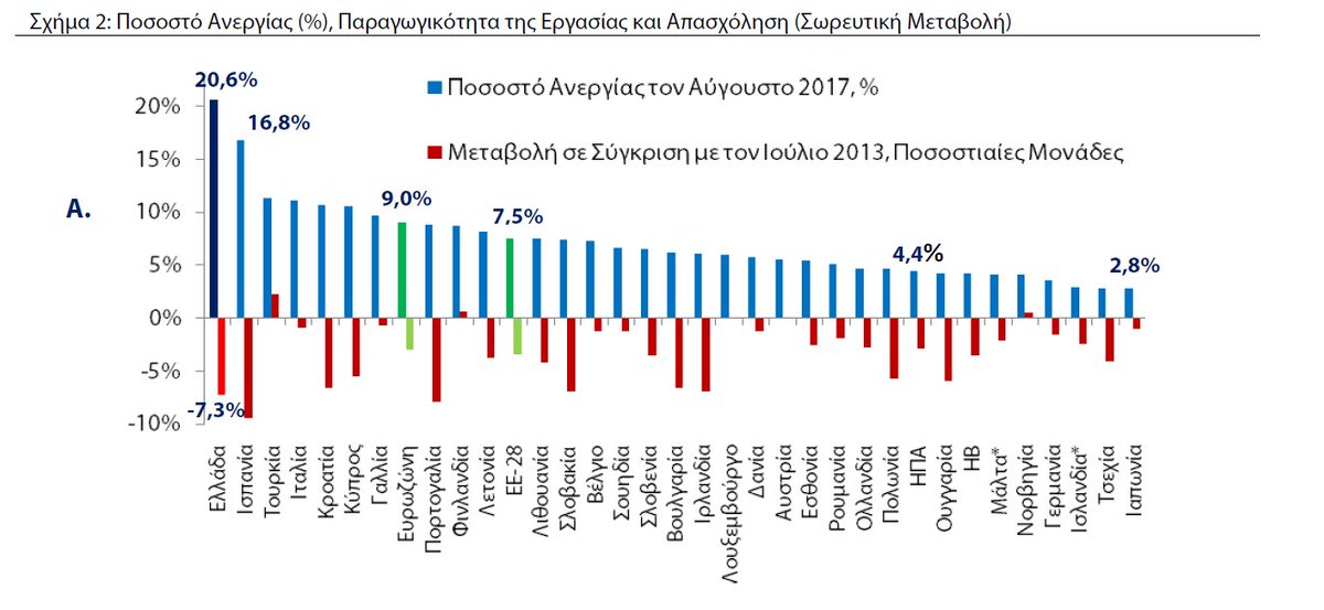 Παρά την επιτάχυνση του ρυθμού πτώσης του ποσοστού ανεργίας στην Ελλάδα, ο λόγος των ανέργων ως προς το εργατικό δυναμικό εξακολουθεί να παραμένει αρκετά μεγαλύτερος σε σύγκριση με το αντίστοιχο μέγεθος στις υπόλοιπες χώρες της Ευρωπαϊκής Ένωσης των 28 κρατών μελών (ΕΕ-28).