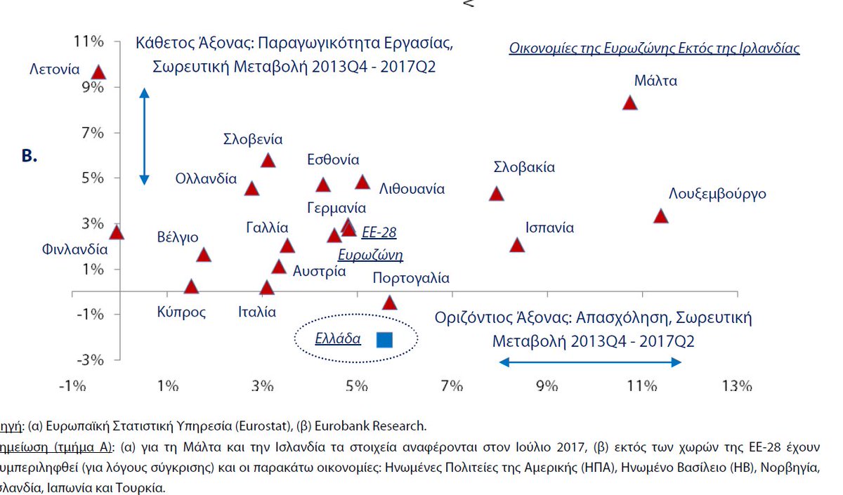 Στο Σχήμα 2Β παρατίθενται η σωρευτική μεταβολή της απασχόλησης (οριζόντιος άξονας) και της παραγωγικότητας της εργασίας (κάθετος άξονας) για τις χώρες της Ευρωζώνης (εκτός Ιρλανδίας λόγω της σημαντικής αναθεώρησης