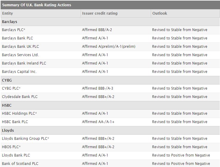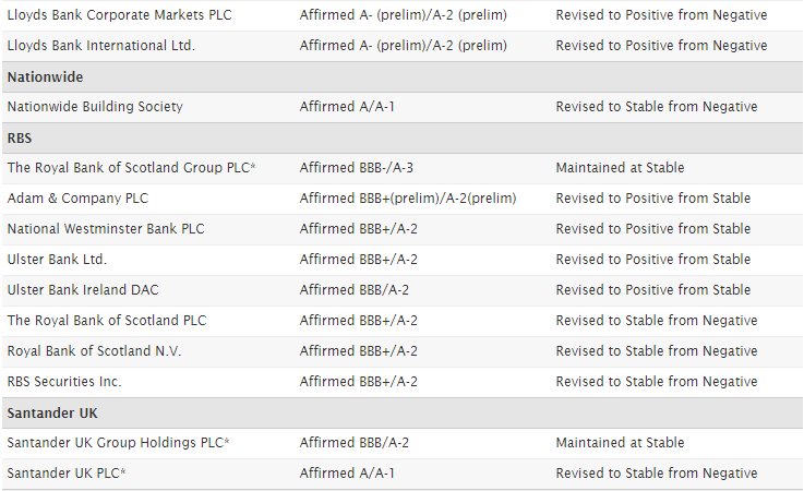 Ειδικότερα, οι προοπτικές αναβαθμίστηκαν για τις Barclays, HSBC και Royal Bank Of Scotland, με τις βαθμολογίες μακροπρόθεσμης πιστοληπτικής ικανότητας να επιβεβαιώνονται σε «ΒΒΒ», «Α» και «ΒΒΒ+», αντίστοιχα.