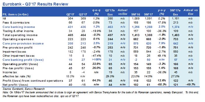 Σε θετική τροχιά κινήθηκαν τα αποτελέσματα της Eurobank το Γ΄ τρίμηνο 2017, καθώς τα καθαρά κέρδη πριν από τις μη συνεχιζόμενες δραστηριότητες και έκτακτα αποτελέσματα ανήλθαν σε 61 εκατ., από 37 εκατ. το Β΄ τρίμηνο 2017 αναφέρει σε report της η Euroχχ με αφορμή την ανακοίνωση αποτελεσμάτων από την τράπεζα για το εννεάμηνο του 2017 αλλά και την τηλεδιάσκεψη που ακολούθησε με τουςε αναλυτές.