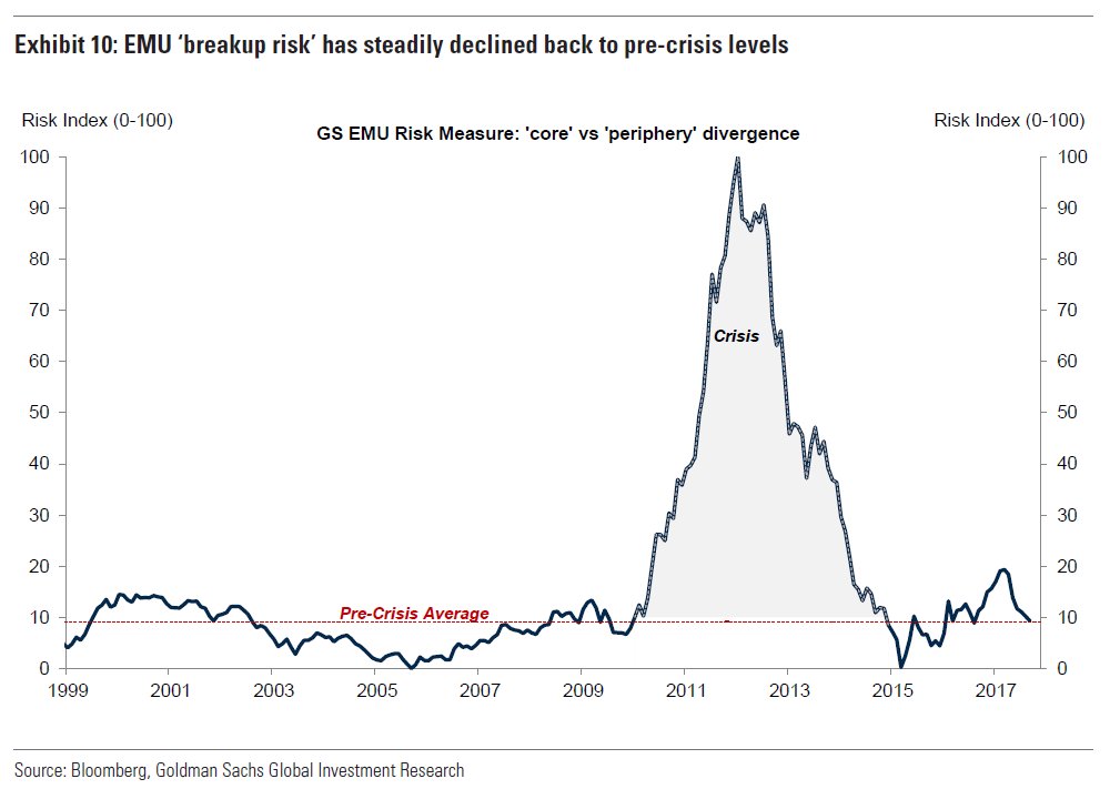 Άλλωστε, από τότε που ο Draghi δήλωσε ότι η ΕΚΤ θα κάνει "οτιδήποτε χρειάζεται για να προστατεύσει το ευρώ", ο κίνδυνος διάσπασης της ΟΝΕ υποχώρησε σταθερά στα επίπεδα πριν από την κρίση.