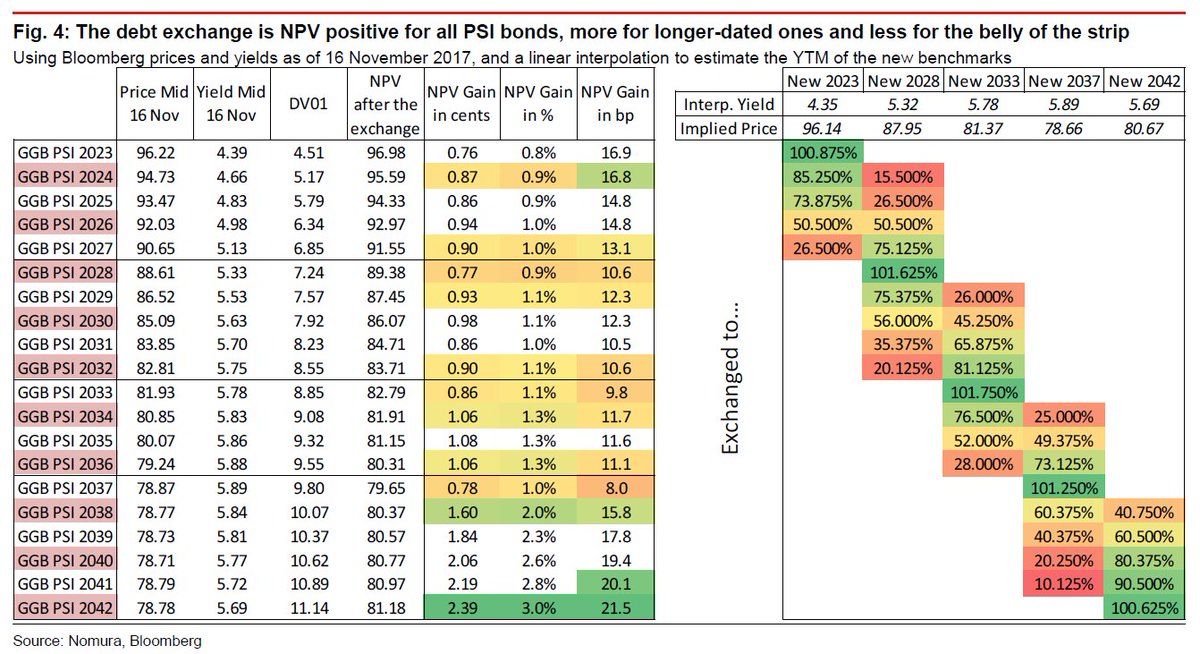 Επιπλέον, οι όροι της ανταλλαγής σχεδιάζονται με τέτοιο τρόπο ώστε ολόκληρη η λειτουργία να είναι θετική σε όρους NPV για τους υφιστάμενους ομολογιούχους όταν προσεγγίζουμε την απόδοση των νέων κριτηρίων αναφοράς και παρεμβάλλοντας τις τρέχουσες αποδόσεις των ελληνικών ομολόγων PSI.
