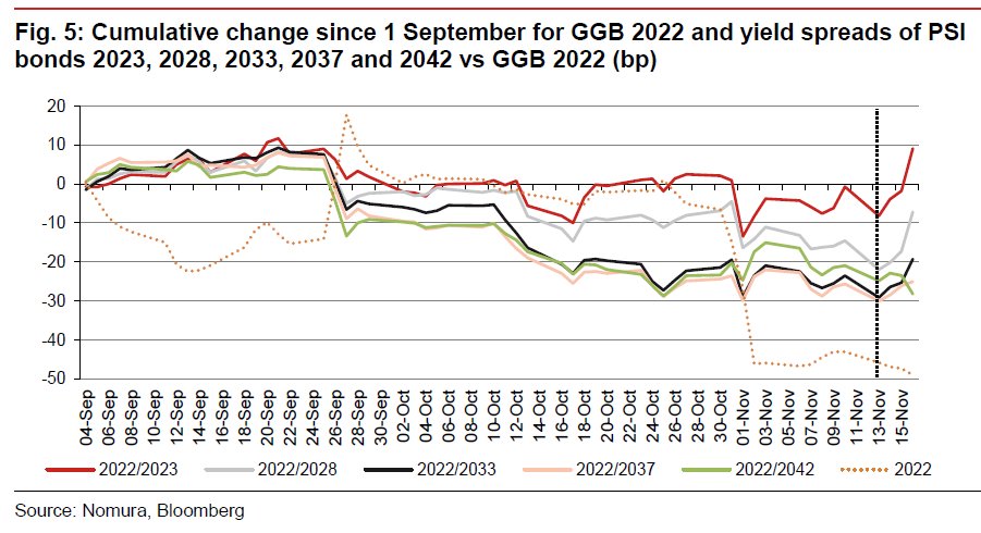 Λαμβάνοντας υπόψη το ράλι των PSI ομολόγων έναντι του ομολόγου λήξης 2022 κατά τη διάρκεια των τελευταίων δύο μηνών, μπορεί να μην είναι τόσο ελκυστική για αυτούς τους επενδυτές οι οποίοι δεν κατέχουν ήδη PSI ομόλογα να αγοράσουν τώρα για να επωφεληθούν από τα κέρδη NPV, αναφέρει η Nomura.