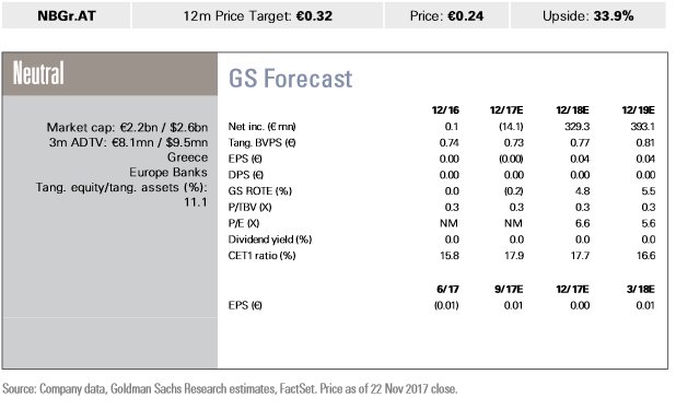 Neutral, ουδετερότητα δηλαδή, είναι η σύσταση της Εθνικής από την Goldman Sachs, η οποία διατηρεί την τιμή στόχο στα 0,32 ευρώ, μετά την ανακοίνωση των αποτελεσμάτων γ' 3μηνου 2017 από την τράπεζα.