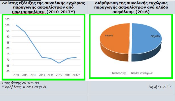 Ειδικότερα, αύξηση 2,5% παρουσιάζει η εγχώρια παραγωγή για τον κλάδο ζωής και μείωση 1,5% για τον κλάδο ζημιών. Με βάση τις ισχύουσες συνθήκες και τάσεις της αγοράς, η ICAP Group AE προβλέπει αύξηση της συνολικής παραγωγής ασφαλίστρων για ολόκληρο το 2017 με ρυθμό της τάξης του 2%, ενώ για το 2018 και 2019 προβλέπεται περαιτέρω αύξηση με ρυθμό 2,3% και 2,5% αντίστοιχα.