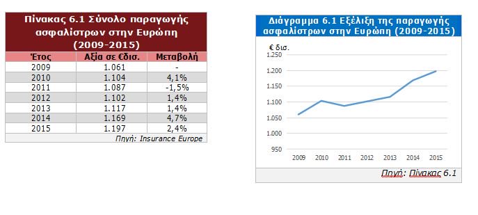 Σύμφωνα με τα στοιχεία της Insurance Europe, το σύνολο της παραγωγής ασφαλίστρων (σε σταθερές συναλλαγματικές ισοτιμίες) στην Ευρώπη ανήλθε το 2015 στο ύψος των €1.197 δισ. καταγράφοντας αύξηση 2,4% σε σχέση με το 2014.