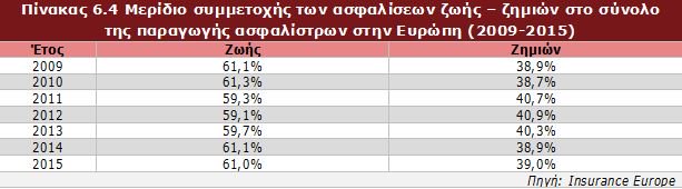 Σχετικά με το μερίδιο συμμετοχής των ασφαλίσεων ζωής στο σύνολο της παραγωγής ασφαλίστρων, αυτό διαμορφώθηκε σε 61% το 2015, υπερέχοντας έναντι των ασφαλειών Ζημιών.