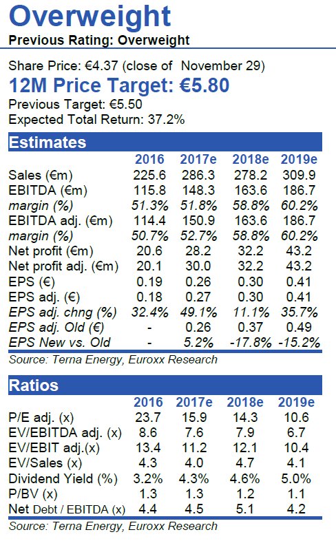 Στα 5,80 ευρώ αυξάνει την τιμή στόχο της Τέρνα Ενεργειακή η Euroxx, διατηρώντας τη σύσταση overweight, μετά την ανακοίνωση των αποτελεσμάτων του εννεαμήνου του 2017.