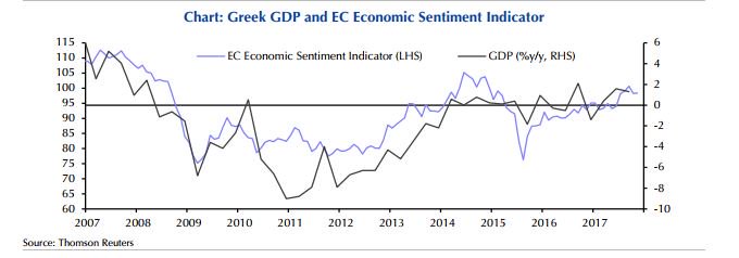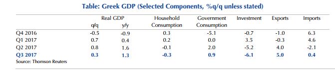 Σε σημερινή (4/12) έκθεση, με αφορμή τη δημοσιοποίηση των στοιχείων της ΕΛΣΤΑΤ για το ΑΕΠ στο γ΄τρίμηνο του 2017, την οποία παρουσιάζει το bankingnews.gr, οι αναλυτές της Capital Economics σημειώνουν ότι η μικρή αύξηση του ΑΕΠ στο γ΄τρίμηνο αντανακλά τη μεγάλη άνοδο στις εξαγωγές, την ώρα που η εγχώρια οικονομία παραμένει αδύναμη.