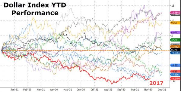Ο δείκτης δολαρίου έχει υποχωρήσει άνω του 9% από την αρχή του 2017, το δολάριο έχει αποδυναμωθεί 10% έναντι του χρυσού και έχει κυριολεκτικά καταρρεύσει έναντι του bitcoin.