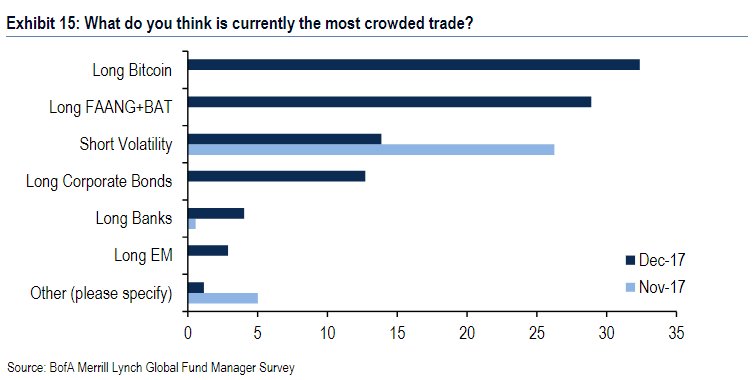 Όπως φαίνεται και στο παρακάτω διάγραμμα («most crowded trades»), οι περισσότερες τοποθετήσεις (32%) για τον Δεκέμβριο αναμένεται να επικεντρωθούν στην περαιτέρω άνοδο του δημοφιλούς ψηφιακού νομίσματος, το οποίο ήδη έχει πραγματοποιήσει ασύλληπτη άνοδο εντός του 2017.