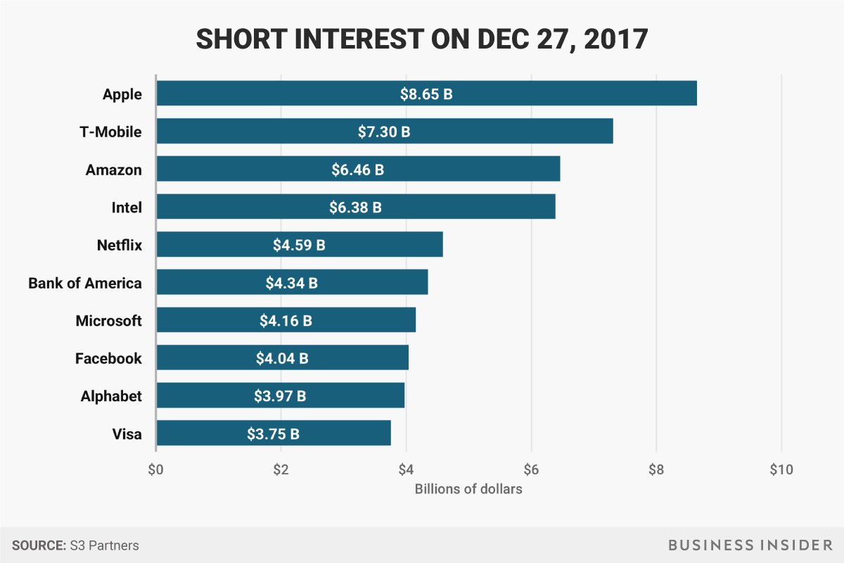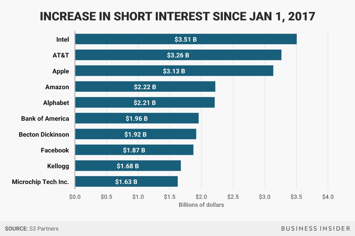 Στις κορυφαίες εταιρείες του τεχνολογικού δείκτη Nasdaq -και η Bank of America- παρατηρούνται οι μεγαλύτερες αυξήσεις των θέσεων «short» τον τρέχοντα Δεκέμβριο αλλά και στο σύνολο του 2017, όπως διαπιστώνει σε ανάλυσή του -με βάση τα στοιχεία της S3 Partners- το Business Insider, το οποίο εστιάζει στην ομάδα των «FANG».