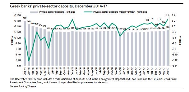 Η αύξηση των καταθέσεων πελατών στα 126,3 δισ. ευρώ στο τέλος Δεκεμβρίου 2017, είναι η υψηλότερη επίδοση του τραπεζικού συστήματος από τον Ιούλιο 2015, οπότε και επιβλήθηκαν κεφαλαιακοί έλεγχοι.