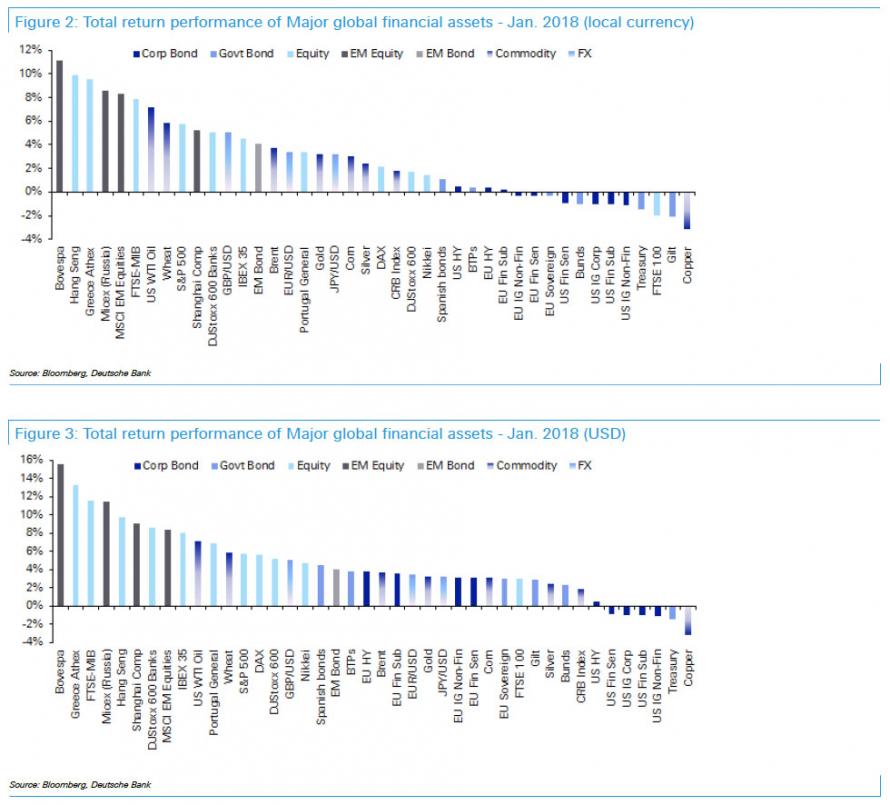Στο τακτικό μηνιαίο report του ο αναλυτής της Deutsche Bank, Jim Reid, τονίζει ότι το 2018 πήρε τη σκυτάλη από το 2017 με τις αγορές, κυρίως τα assets υψηλού κινδύνου, να εμφανίζουν μονοψήφια άνοδο.