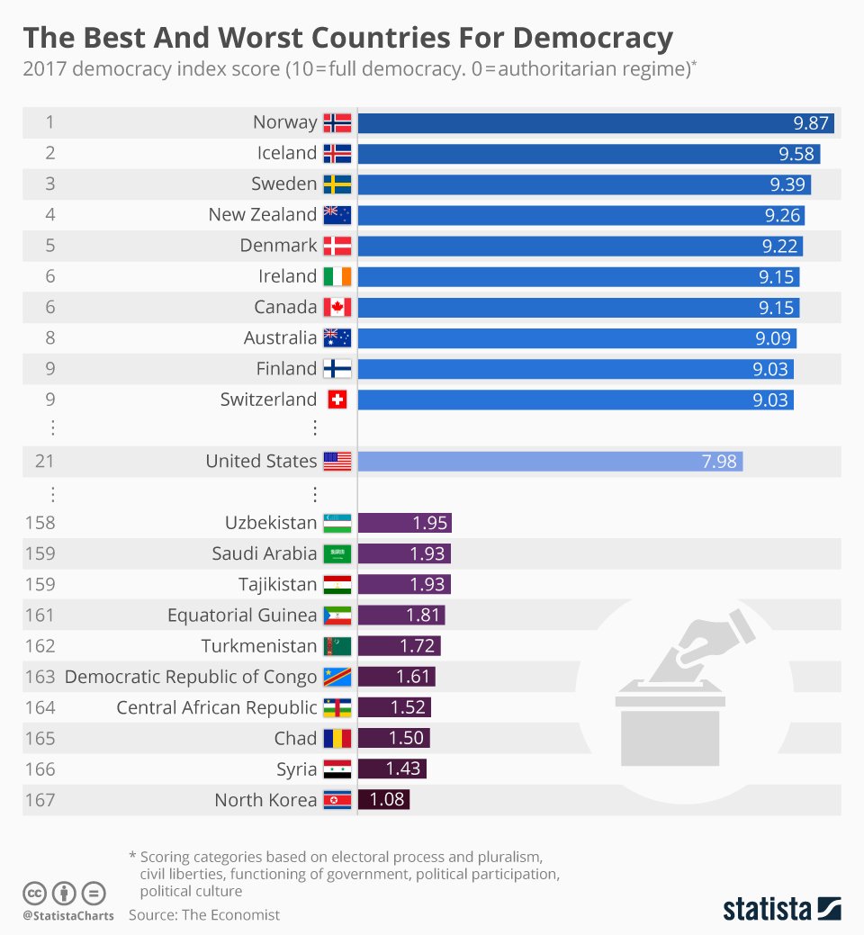 Η Νορβηγία είναι η καλύτερη Δημοκρατία του πλανήτη με βάση τα κριτήρια του δείκτη Δημοκρατίας της Economist Intelligence Unit, με την Ελλάδα να καταλαμβάνει την 38η θέση.