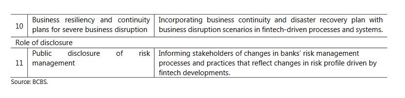 Η BCBS αναγνωρίζει επίσης ότι τα ζητήματα που σχετίζονται με την Fintech τεχνολογία περιλαμβάνουν διάφορους τομείς τόσο με θεσμικό όσο και εποπτικό χαρακτήρα.