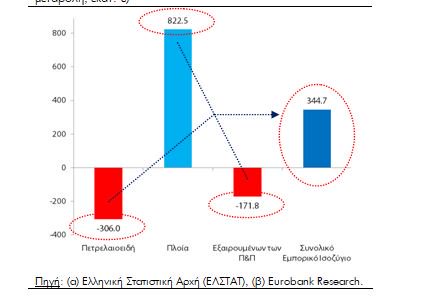 Η κατηγορία των εμπορευμάτων εξαιρουμένων των πετρελαιοειδών και πλοίων συνεισέφερε 10,6 ΠΜ (18,3 YoY%) και η αντίστοιχη συνεισφορά των πετρελαιοειδών ήταν 9,5 ΠΜ (44,1 YoY%).