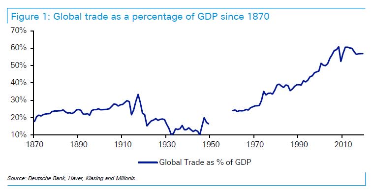 Παλαιότερα, από το 1870, το παγκόσμιο εμπόριο ως ποσοστό του ΑΕΠ ήταν πολύ χαμηλότερο και, επίσης, πιο ασταθές.
