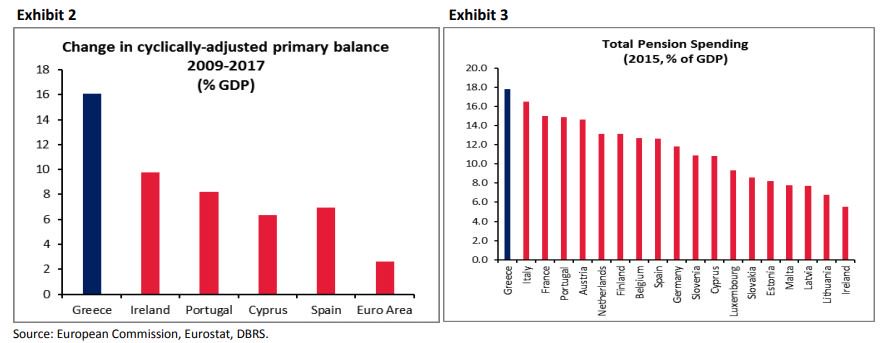 Από πλευράς δαπανών, η Ελλάδα κατάφερε να εξορθολογίσει τις συνταξιοδοτικές της δαπάνες με σημαντικές συνταξιοδοτικές μεταρρυθμίσεις, το 2010 και το 2016. Λαμβάνοντας υπόψη όλες τις μεταρρυθμίσεις από το 2009 έως το 2015, η προβλεπόμενη μείωση των συνταξιοδοτικών δαπανών έως το 2060 υπερβαίνει το 14% του ΑΕΠ!