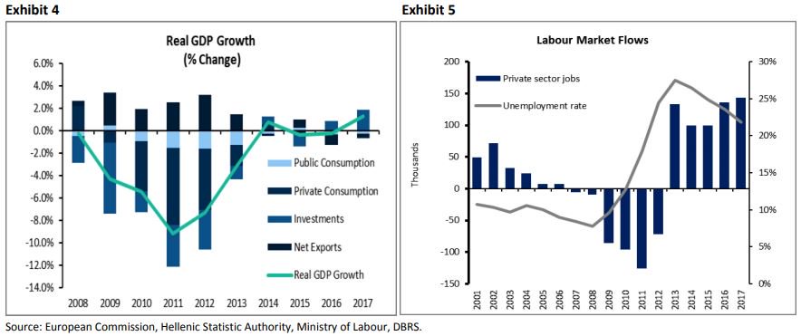 Η συνεχιζόμενη βελτίωση στην αγορά εργασίας αντανακλάται στο μειωμένο ποσοστό ανεργίας, στο 20,8% του εργατικού δυναμικού στα τέλη Δεκεμβρίου 2017, από 27,5% το 2013».