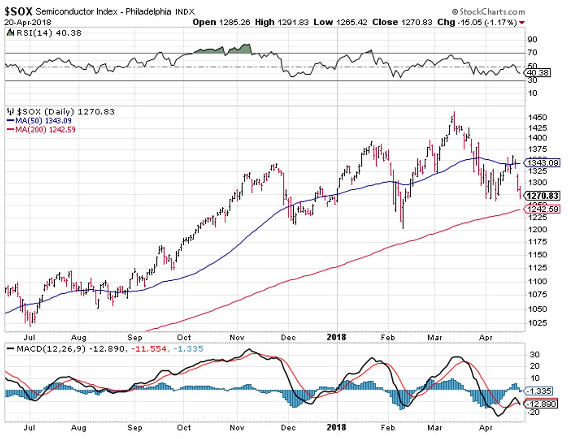 Το Διάγραμμα-2 απεικονίζει την αρνητική πορεία του SOX (Philadelphia Semiconductor Index) κατά το τελευταίο χρονικό διάστημα και την κρίσιμη περιοχή στηρίξεως των 1260± μονάδων (βλ. RSI, MACD).