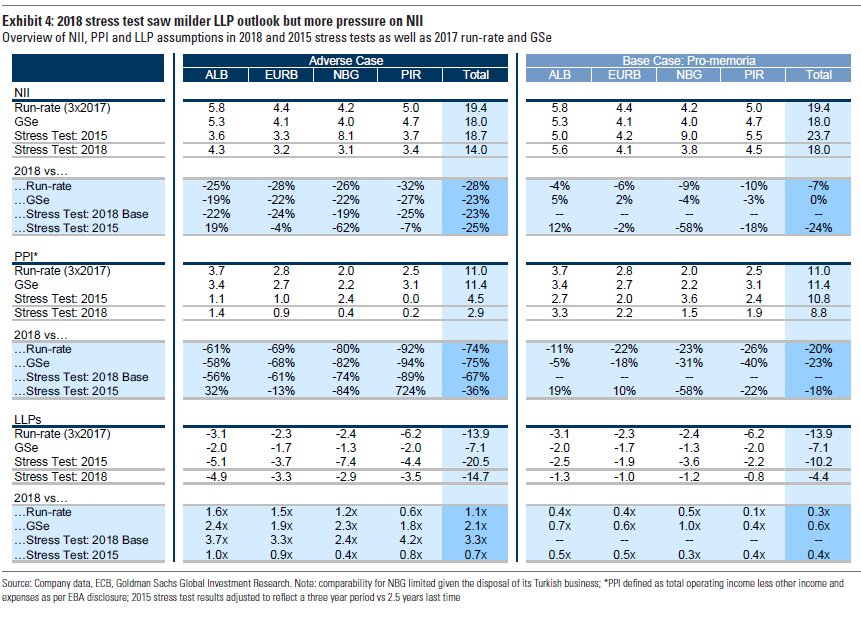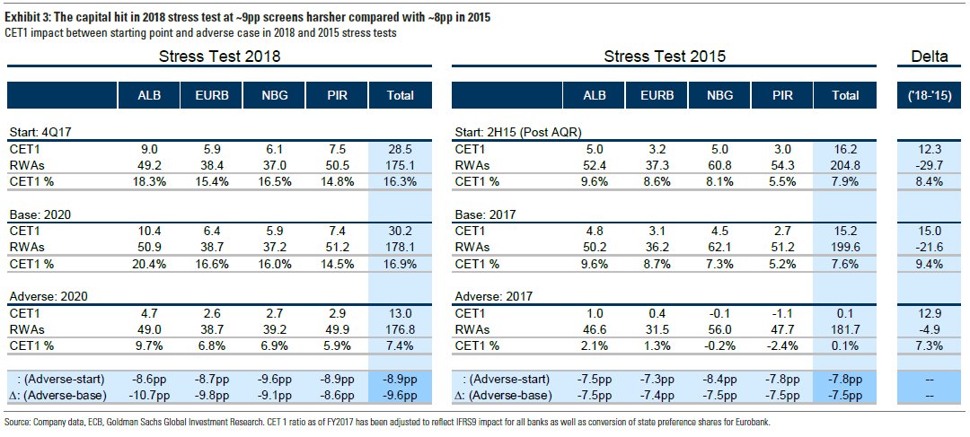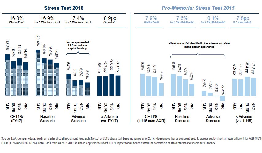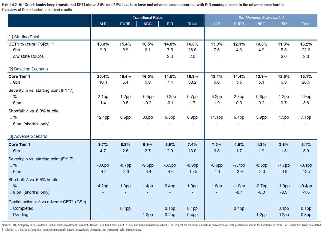 Ειδικότερα, στη σημερινή, 7 Μαΐου 2018, ανάλυση υπό τον τίτλο "Greek banks avoid recaps, sector recovery ongoing" (Οι ελληνικές τράπεζες αποφεύγουν τις ανακεφαλαιοποιήσεις, η ανάκαμψη του κλάδου συνεχίζεται), που σας παρουσιάζει το www.bankingnews.gr, η Goldman Sachs τονίζει ότι το αποτέλεσματα των stress test φαίνεται ευθυγραμμισμένο με τις προσδοκίες.