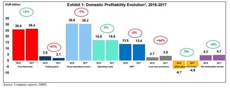 Όπως σχολίαζε η DBRS σε έκθεσή της νωρίτερα μέσα στο 2018, το περασμένο έτος σηματοδότησε τη δεύτερη συνεχόμενη χρονιά καθαρών κερδών για τις μεγάλες ισπανικές τράπεζες, σε συνδυασμό με μία σημαντική μείωση στα μη εξυπηρετούμενα δάνεια (NPLs).