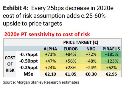 Ωστόσο, η Morgan Stanley πιστεύει ότι το κόστος είναι αυξημένο με τον δείκτη ROTE να διαμορφώνεται στο 3-6% με βάση τις εκτιμήσεις του 2020, με τους τίτλους να διαπραγματεύονται σε 0,2-0,4x σε όρους P / TBV (2020), αντικατοπτρίζοντας την πρόοδο εκκαθάρισης των βιβλίων δανείων.