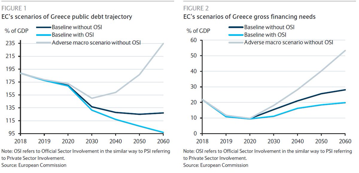 Η αυξανόμενη απόκλιση μεταξύ βασική γραμμή με και χωρίς την επίσημη εμπλοκή του επίσημου τομέα (OSI) μετά το 2040 συνεπάγεται ότι το μοντέλο βασίζεται σε θετικές μακροοικονομικές υποθέσεις που περιλαμβάνουν την υπόθεση ότι η Ελλάδα είναι σε θέση να μειώσει το χρέος της από μόνη της.