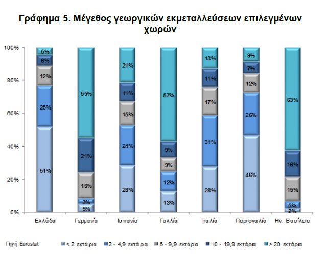 Περισσότερες από τις μισές (περίπου 51% το 2013) αφορούσαν σε γεωργικές εκμεταλλεύσεις κάτω των 2 εκταρίων (20 στρέμματα), ενώ τα αντίστοιχα ποσοστά σε άλλες μεσογειακές χώρες είναι χαμηλότερα (Γράφημα 5).