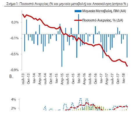 Αξίζει να σημειώσουμε ότι στο 1ο τετράμηνο του 2018 η μέση ετήσια μεταβολή της απασχόλησης (1,3%) παρουσίασε επιβράδυνση σε σύγκριση με το αντίστοιχο διάστημα του προηγούμενου έτους (1,7%).