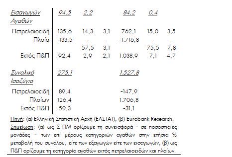 Στο ίδιο διάστημα οι εισαγωγές προϊόντων ενισχύθηκαν οριακά κατά 0,4% λόγω της υψηλής πτώσης των εισαγωγών πλοίων (αρνητική συμβολή της τάξης των -7,8 ΠΜ).