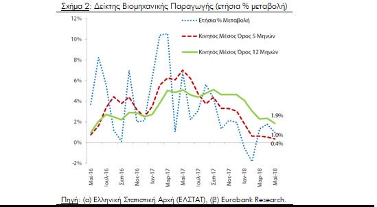 Βάσει των παρατηρήσεων του Απριλίου και του Μαΐου 2018, ο δείκτης βιομηχανικής παραγωγής στην Ελλάδα παρουσίασε βελτίωση σε σύγκριση με το 1ο τρίμηνο 2018 (μέση ετήσια % μεταβολή της τάξης του 1,4% από -0,3%). Ωστόσο, όπως παρουσιάζεται στο Σχήμα 2, σε σύγκριση με την απόδοση που είχε το περασμένο έτος – σε όρους ετήσιας % μεταβολής - καταγράφεται σημαντική επιβράδυνση.
