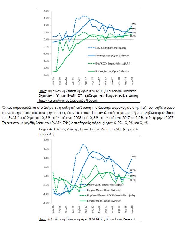 Αυτή η εξέλιξη συνδέεται με την επιτάχυνση του ρυθμού ανόδου των διεθνών τιμών του πετρελαίου. Επί παραδείγματι, η ετήσια % μεταβολή του ΕνΔΤΚ από 0,2% τον Μάρτιο αυξήθηκε στο 0,5% τον Απρίλιο, στο 0,8% τον Μάιο και στο 1,0% τον Ιούνιο 2018 (τελευταία διαθέσιμη παρατήρηση).